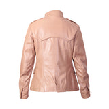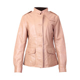 Dressy coat styled women's Nappa leather jacket with epaulettes, made of sheepskin leather. Features a hip flare fit, front button fastening, two button down side pockets, long sleeves with button cuffs and light weight lining. The back length for size L is 61 cm.